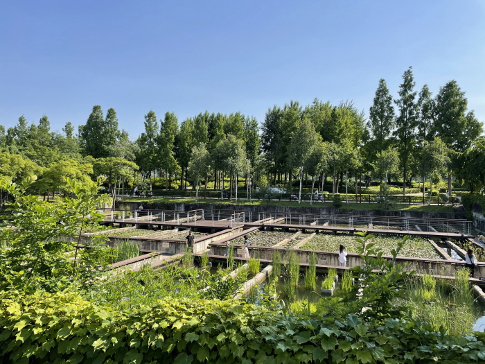 수질정화원은 물을 정화하는 여러 수생식물들을 볼 수 있다. 잔잔한 물위로 여러 수생식물들이 살고있다.